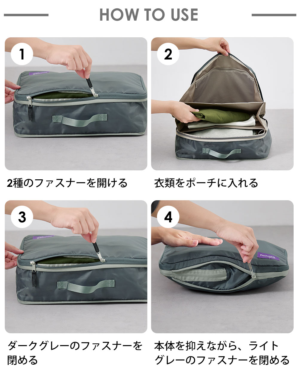 2. 【關閉】:將所有衣物裝好後,拉上深灰色的開口拉鍊。