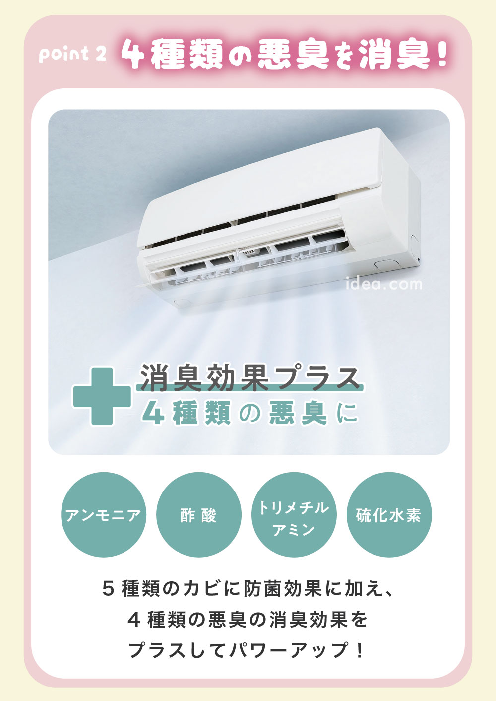 3. 抗菌兼消臭,室內空氣變清新 不僅防霉,它還能有效分解冷氣機內積聚的難聞霉味與悶臭味。不使用刺鼻的化學香精強行掩蓋,而是從根源瓦解異味,讓冷氣吹出的風隨時保持自然的潔淨感。